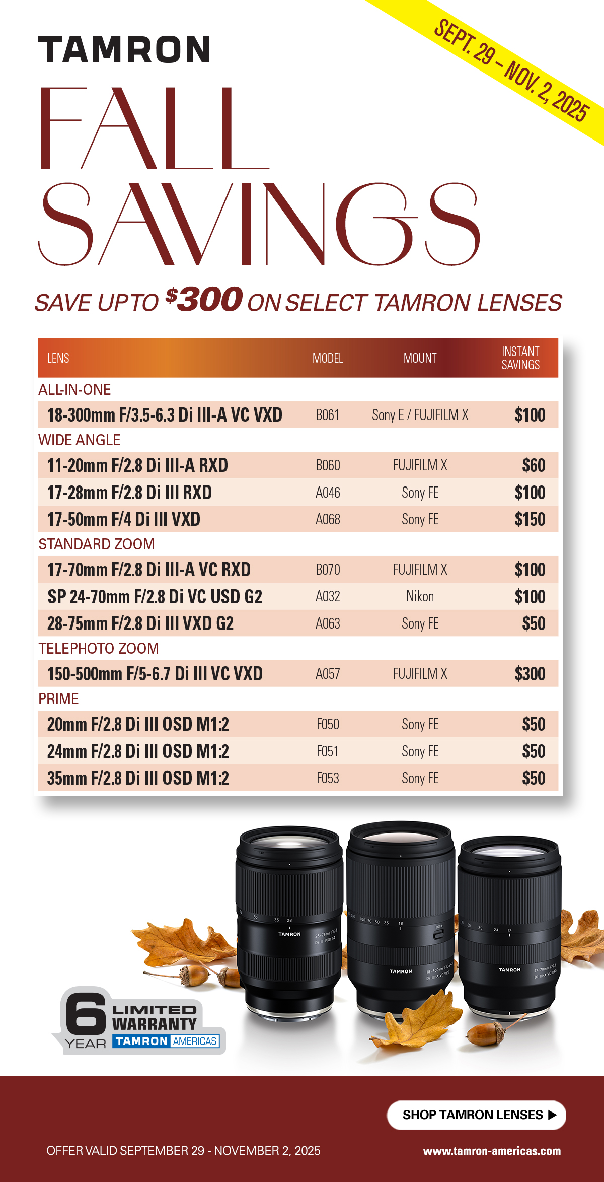 Tamron Fall Savings – Save up to $300 on select lenses for Sony E-mount, Nikon Z mount and FUJIFILM X-mount, through 11/2/25!