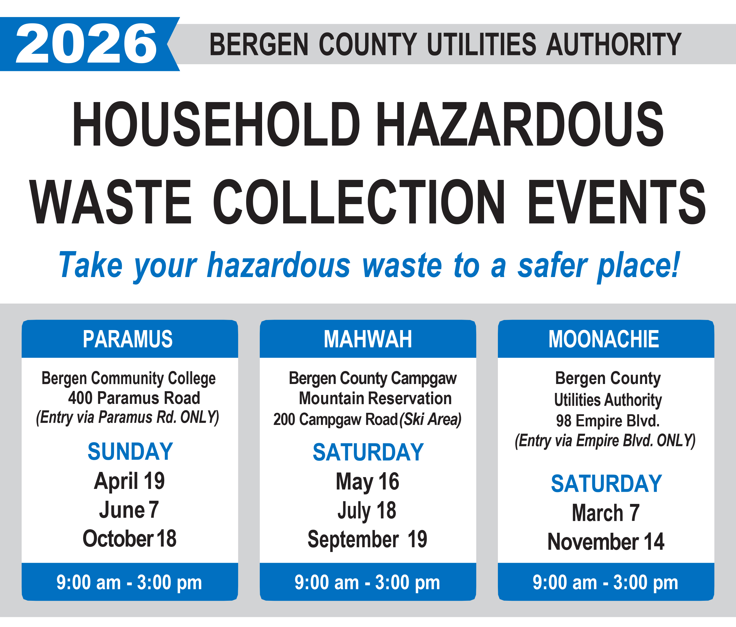 Bergen County Hazardous Waste Days 2026 – Most photo chemicals are considered hazardous waste so this is a great opportunity to safely dispose of what you are no longer using. This event is open to Bergen County, New Jersey residents only with photo ID. The following items are not accepted so please do not bring computers, electronics, batteries (only car and rechargeable accepted), or tires to these collections. If you have questions please call the Bergen County Hazardous Waste Hotline 201-807-5825. Information for other New Jersey Counties can be found at the NJ Hazardous Waste Coordinators website.